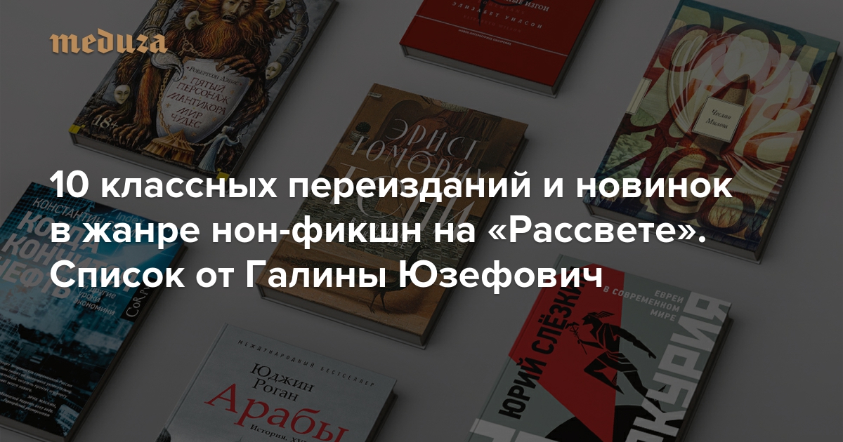 На выходных 14-15 сентября в Москве пройдет первая «умная книжная ярмарка» «Рассвет», на которой будут представлены 80 больших и маленьких независимых издательств. «Рассвет» — фестиваль проекта InLiberty. Литературный критик «Медузы» Галина Юзефович изучила издательский ассортимент и составила список из десяти самых интересных переизданий и новинок нон-фикшн.