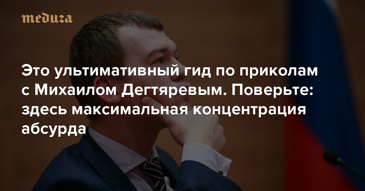20 июля Михаила Дегтярева назначили временно исполняющим обязанности главы Хабаровского края вместо уволенного губернатора Сергея Фургала. И тут началось: что ни день, то новый повод написать шапито про Дегтярева. Всю неделю «Медуза» сдерживалась и писала в основном только серьезные новости про нового главу региона, но поток абсурдных новостей так и не иссяк. В общем, мы сдались — и написали одно большое шапито сразу обо всем, что происходит с Дегтяревым.