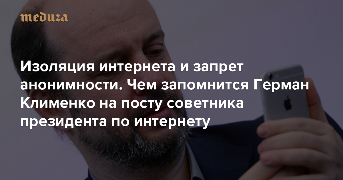 13 июня 2018 года Германа Клименко уволили с должности советника президента по интернету, которую он занимал два с половиной года. За время своей работы он успел сделать немало неожиданных заявлений о блокировках интернет-мессенджеров, запрете биткоина и изоляции российского интернета по образцу Китая (все эти явления Клименко горячо приветствовал). «Медуза» вспоминает свершения Клименко на его теперь уже бывшей работе.