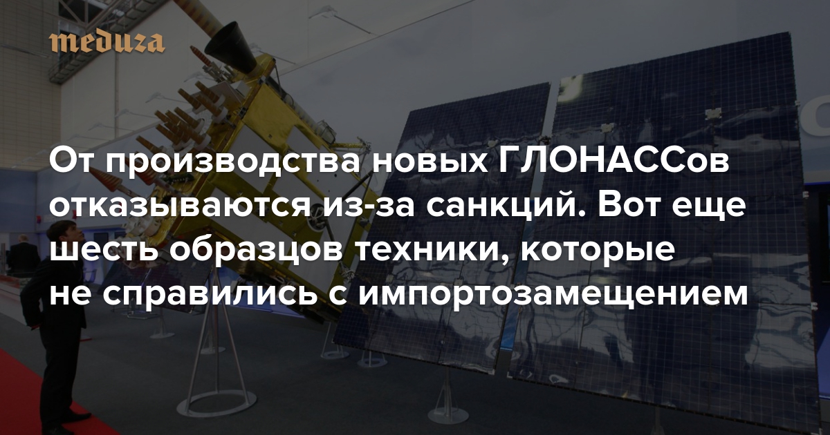 В конце июня стало известно, что Россия откажется от финансирования серийного производства новых навигационных спутников ГЛОНАСС-К. Как следует из поправок к Федеральному бюджету на 2019 год, деньги потратят на переделку этих спутников. Цель — заменить иностранные комплектующие, которые запрещено поставлять в Россию из-за санкций, на пока не существующие российские. Одновременно американские СМИ узнали о возможных проблемах с импортозамещением материалов для новейшего ракетного комплекса «Авангард». «Медуза» рассказывает, почему не получается запустить новые ГЛОНАССы и какие еще образцы российской техники пострадали от американских, европейских и украинских санкций.