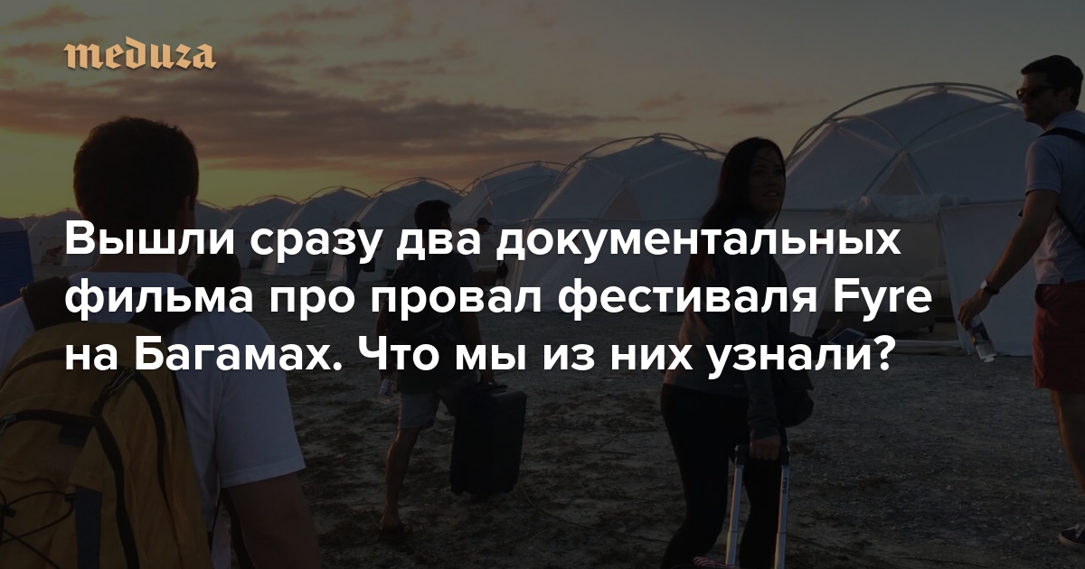 В апреле 2017 года на Багамах должен был состояться Fyre Festival — музыкальный фестиваль, который позиционировался как Coachella для модных и богатых; цена билетов доходила до 250 тысяч долларов. Ничего не вышло: когда зрители приехали на фестиваль, выяснилось, что вместо роскошных вилл их ждут палатки, вместо роскошной еды — бутерброд с сыром, а концертов не будет, потому что сцена не построена. Шумный провал Fyre Festival много обсуждался, а его организатора вскоре задержали агенты ФБР. На этой неделе сразу на двух стриминговых сервисах вышли документальные фильмы об истории Fyre Festival: «Мошенничество Fyre», снятый режиссерами Дженнер Фурст и Джулией Нейсон, — на сайте Hulu, и «Fyre», сделанный Крисом Смитом, — на Netflix. Редактор «Медузы» Александр Горбачев посмотрел оба — и рассказывает, что нового можно узнать из них об истории Fyre Festival и его организаторов.