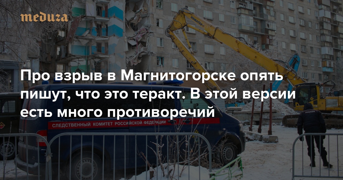 «Исламское государство» взяло на себя ответственность за взрывы в жилом доме и микроавтобусе в Магнитогорске во время новогодних праздников. Сразу после этого Следственный комитет в очередной раз выступил с заявлением, что основная версия обрушения дома — взрыв бытового газа, и призвал не верить террористам. Версию о подготовке теракта в Магнитогорске после взрыва выдвинули сразу несколько СМИ, ссылаясь на неназванные источники; 18 января у этой версии появились новые подробности. «Медуза» рассказывает, что о событиях в Магнитогорске сообщают разные источники.