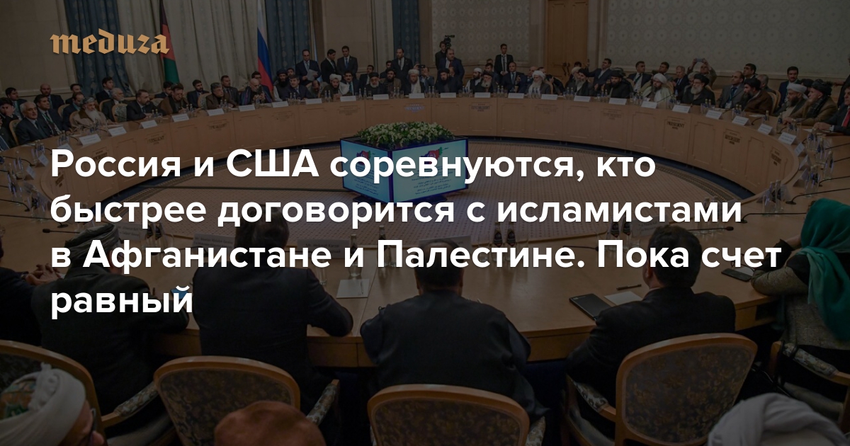 В Москве 13 февраля заканчиваются переговоры между главными палестинскими политическими силами при посредничестве России. Они прошли на фоне сообщений о том, что США готовят «сделку века» по урегулированию арабо-израильского конфликта, которую собирается анонсировать уже этой весной. В последние полгода Москва и Вашингтон начали настоящее соревнование за то, кто быстрее урегулирует конфликты на Ближнем Востоке и в Афганистане — с участием группировок, которые считаются экстремистскими и террористическими. «Медуза» рассказывает о главных эпизодах этой дипломатической игры.