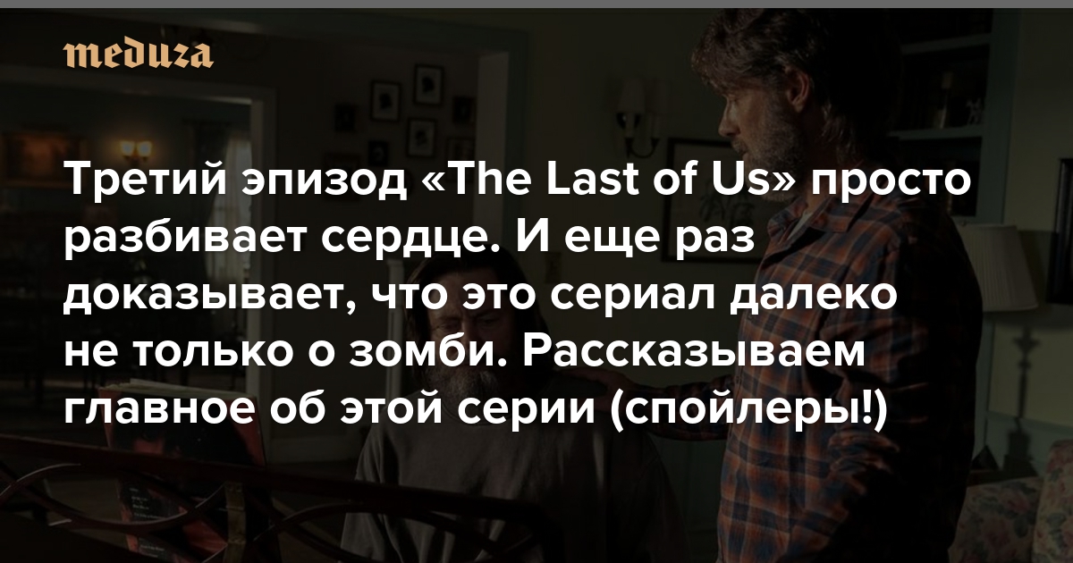 30 января на телеканале HBO и стриминговом сервисе HBO Max вышел третий эпизод сериала «Одни из нас» («The Last of Us»), снятого по одноименной игре. В третьей серии авторы — Крэйг Мэйзин, Нил Дракманн и Питер Хоар — расширяют вселенную сериала и впервые фокусируются на второстепенных персонажах. «Медуза» рассказывает о том, что произошло в третьей серии — и как зрители приняли этот неожиданный эпизод.