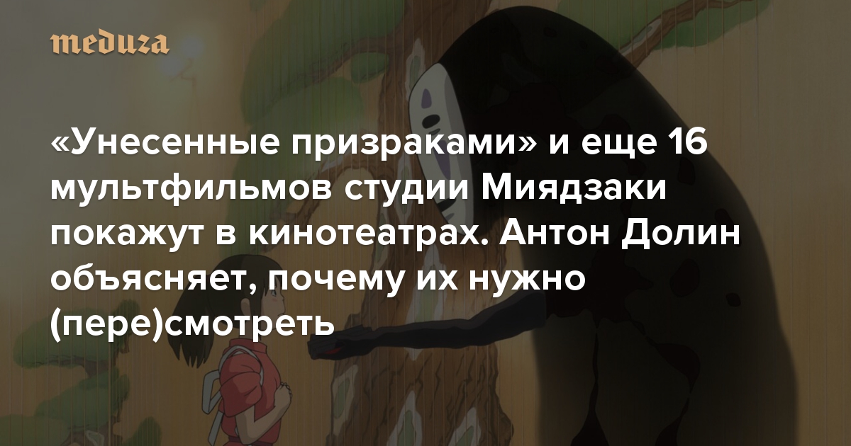 Кинокомпания «Пионер» 27 декабря выпустила в повторный прокат отреставрированную копию шедевра японской анимации — «Унесенных призраком» Хаяо Миядзаки, причем в новом переводе. Также на большом экране покажут 16 других фильмов студии «Гибли», которую возглавляет режиссер. Кинокритик «Медузы» Антон Долин объясняет, почему обязательно нужно посмотреть (или пересмотреть) картины Миядзаки.