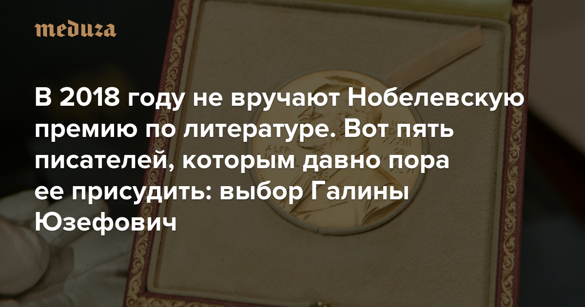 4 октября в Стокгольме могли бы назвать лауреата Нобелевской премии по литературе. Но в мае Нобелевский комитет объявил, что в 2018 году, впервые за 75 лет, награду по литературе вручать не будут — из-за скандала с утечкой данных в Шведской академии, которая занимается отбором претендентов и награждением. Вручение обещают возобновить в 2019-м; тогда же будут объявлены лауреаты сразу за два года. Пока Шведская академия взяла перерыв, литературный критик «Медузы» Галина Юзефович предлагает собственный список писателей, которым можно было бы вручить Нобелевскую премию уже в этом году, и объясняет, за что именно.
