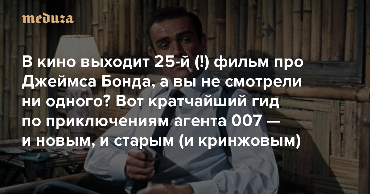 В кино выходит 25-й (!) фильм про Джеймса Бонда, а вы не смотрели ни одного? Вот кратчайший гид по приключениям агента 007 — и новым, и старым (и чуть-чуть кринжовым)