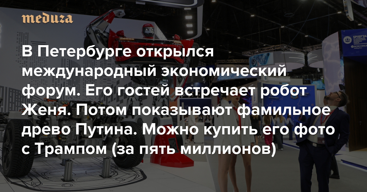 В Петербурге открылся международный экономический форум. Его гостей встречает робот Женя. Потом показывают фамильное древо Путина. Можно купить его фото с Трампом (за пять миллионов)