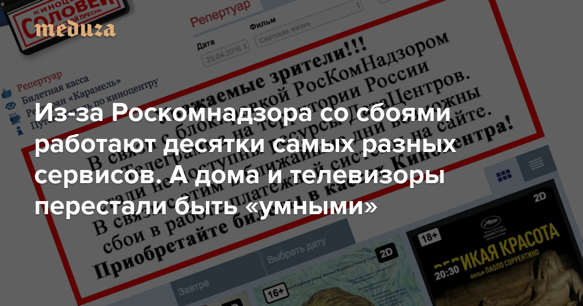 Московский кинотеатр «Соловей» с 21 апреля предупреждает на своем сайте, что из-за действий Роскомнадзора могут быть сбои при покупке билетов онлайн.