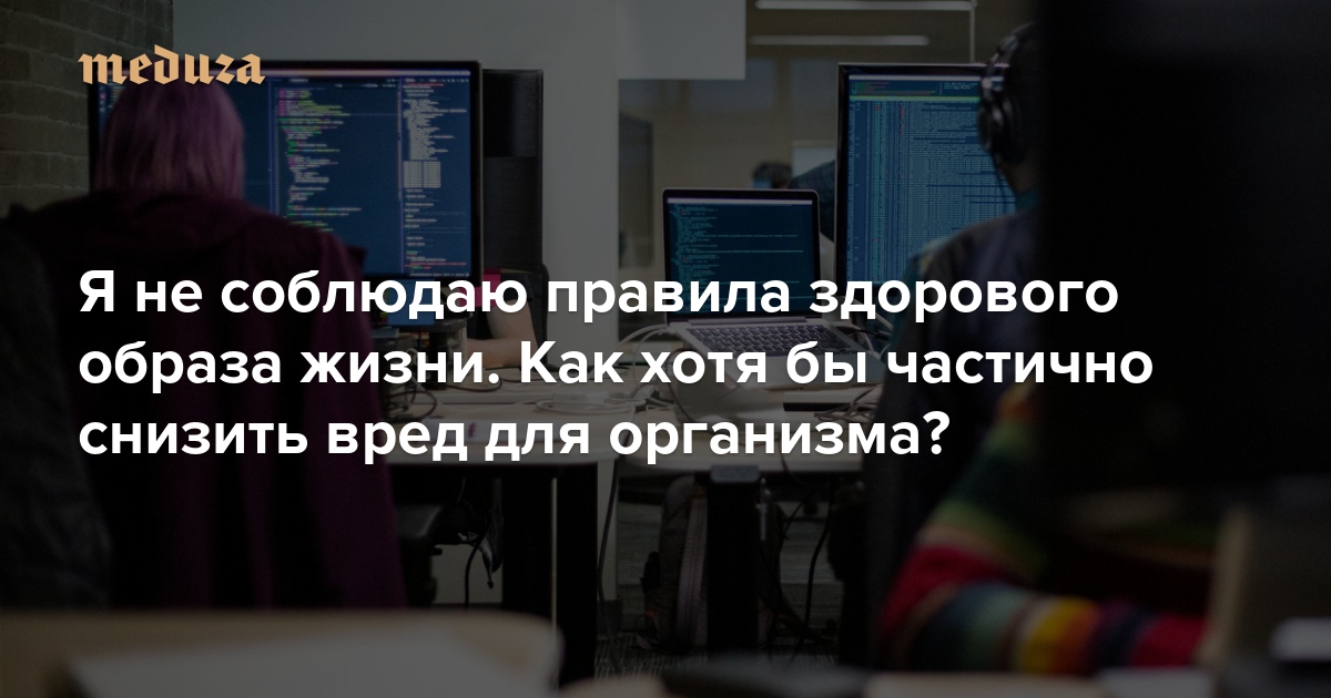 Не у каждого человека есть возможность или желание вести здоровый образ жизни: кто-то хронически недосыпает, кто-то десятый год бросает курить. Но это не значит, что для здоровья в таком случае ничего нельзя сделать. «Медуза» выбрала несколько не самых здоровых ситуаций и разобралась, что в них вредного и как минимизировать ущерб.
