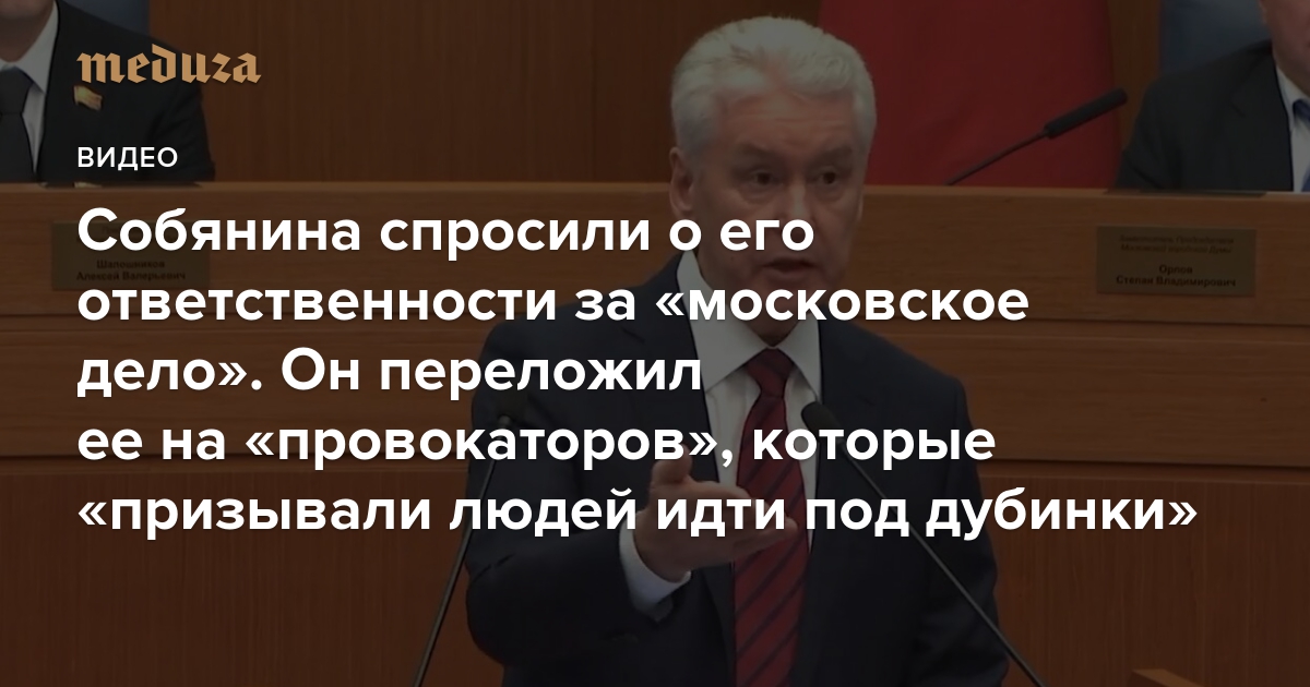 Мэр Москвы Сергей Собянин 18 декабря выступал в Мосгордуме и отвечал на вопросы депутатов. С трудом, но депутату от «Яблока» Дарье Бесединой все же удалось задать мэру вопрос, чувствует ли он ответственность за «московское дело» и его фигурантов. Собянин, отвечая на вопрос, возложил ответственность за произошедшее на «провокаторов», которые «призывали людей идти под дубинки» и «штурмовать мэрию».