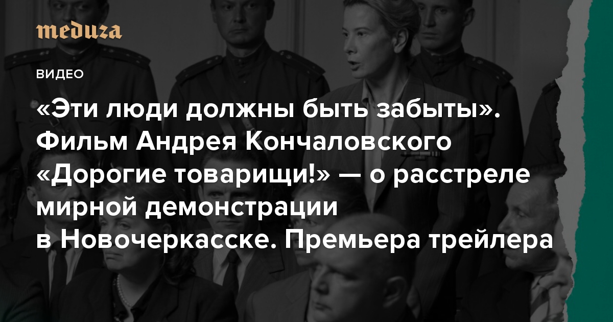 «Дорогие товарищи!» — фильм режиссера Андрея Кончаловского о расстреле мирной демонстрации в Новочеркасске в 1962 году. Тогда погибли более 25 человек, более 85 были ранены. Семерых участников демонстрации приговорили к расстрелу, более ста получили по десять лет тюрьмы. Несколько десятилетий информация о разгоне демонстрации в Новочеркасске была засекречена. Подробнее об этих событиях — в репортаже Даниила Туровского. Картина «Дорогие Товарищи!» участвует в конкурсе Венецианского кинофестиваля, где ее покажут 7 сентября. В главной роли — Юлия Высоцкая. «Медуза» представляет трейлер фильма.