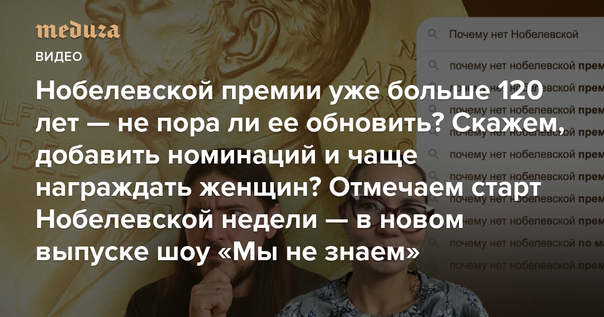 Нобелевской премии уже больше 120 лет — не пора ли ее обновить? Скажем, добавить номинаций, пересмотреть правила и чаще награждать женщин? Отмечаем старт Нобелевской недели — в новом выпуске шоу «Мы не знаем»